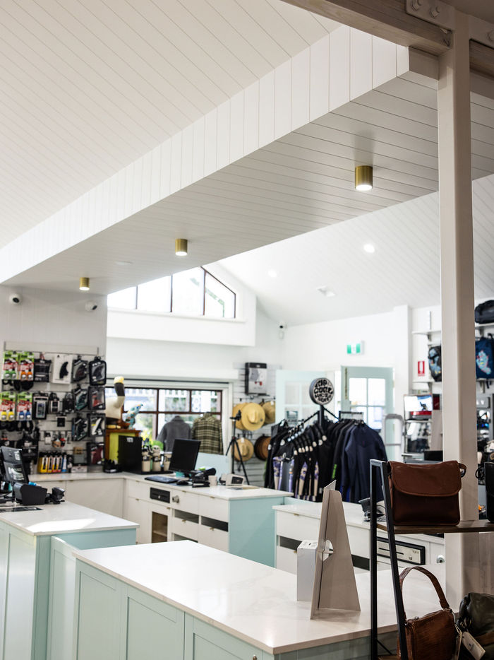 Aquatique Surf Shop, located along the scenic promenade of Huskisson, underwent extensive renovations—virtually a complete rebuild from the ground up. The result is a timeless, classic coastal aesthetic that blends seamlessly with its surroundings. Every detail has been meticulously considered, with Moffat Builders handcrafting many elements, including custom-built windows. The carefully selected materials—charred timber, recycled brickwork, and weatherboard cladding—not only enhance the coastal character but are also chosen for their durability in the face of harsh seaside conditions.