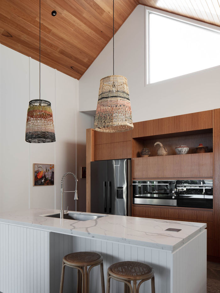 Shearwater House, nestled along the exquisite coastline of Currarong, embodies a design that echoes the grace of a sea bird. The building's form harmoniously blends with the coastal landscape, evoking a sense of natural beauty and serenity. The choice of materials, including oiled blackbutt timber, expansive glass, and honed blockwork, has been thoughtfully curated to complement and withstand the challenging coastal conditions.